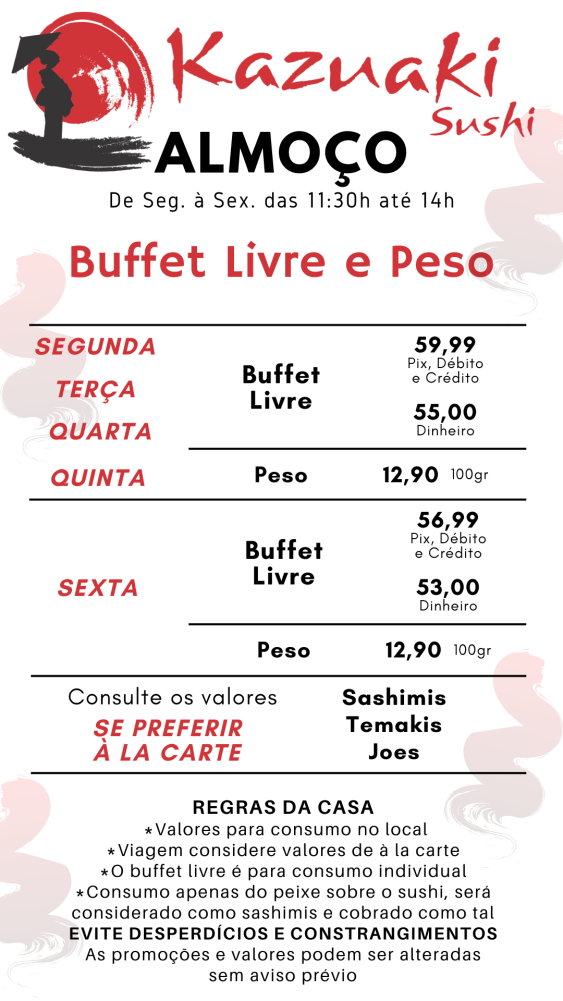 DELIVERY - Segunda à Sábado das 18:30h até 23h Almoço - Segunda à Sexta das 11:30h até 14h Jantar - Segunda à Sábado das 18:30h até 23h