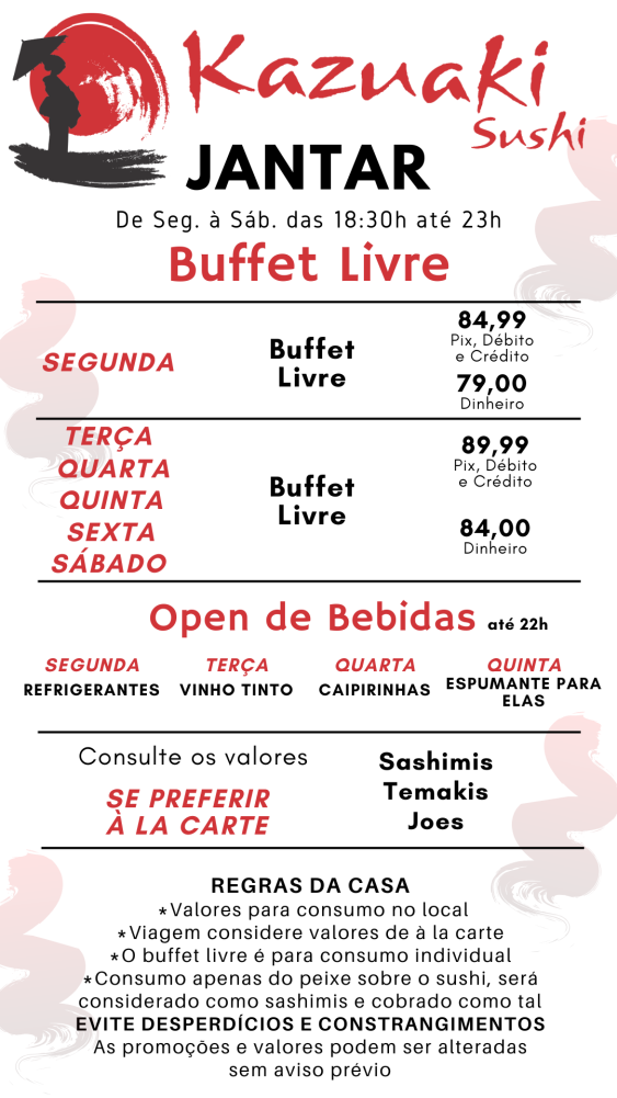 DELIVERY - Segunda à Sábado das 18:30h até 23h Almoço - Segunda à Sexta das 11:30h até 14h Jantar - Segunda à Sábado das 18:30h até 23h